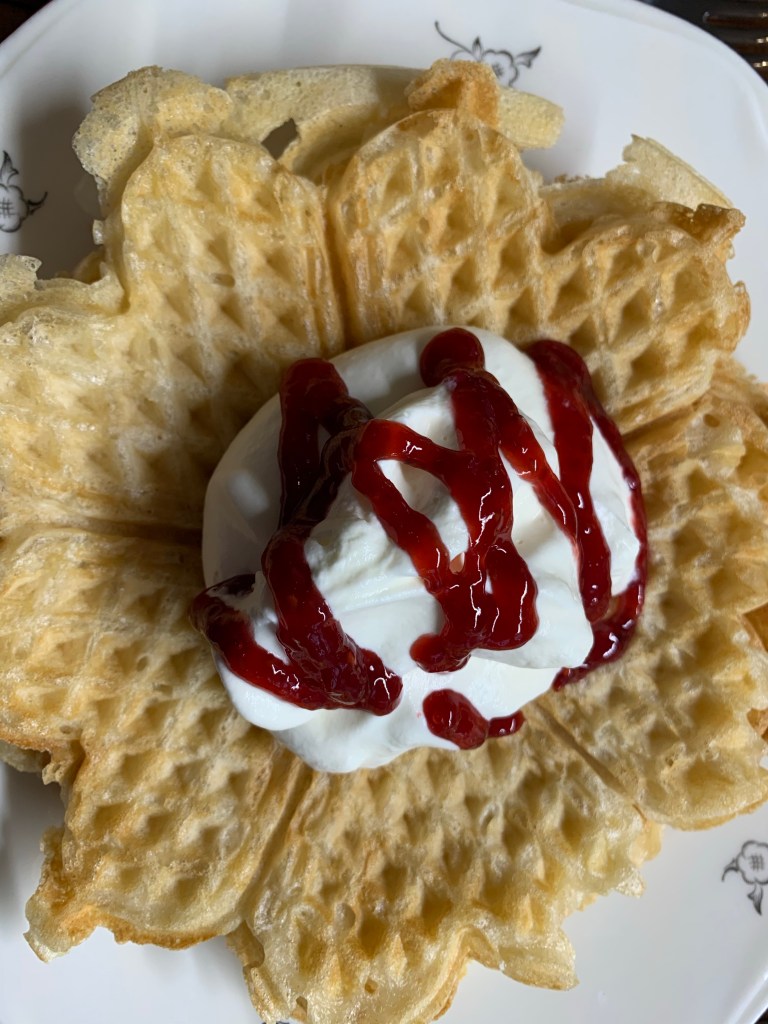 Till mellanmål bjöds det på hembakad rulltårta med en klick grädde och en halva pärsika.
