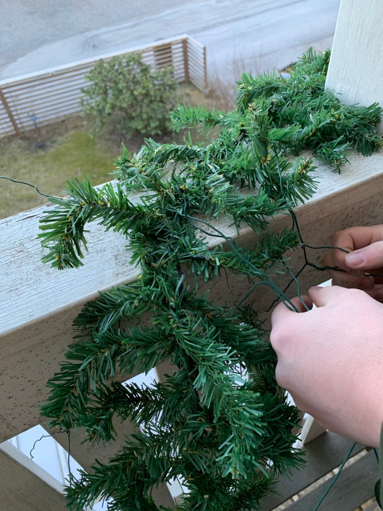Alex plockar ner julbelysningen från balkongen. Bättre sent än aldrig !